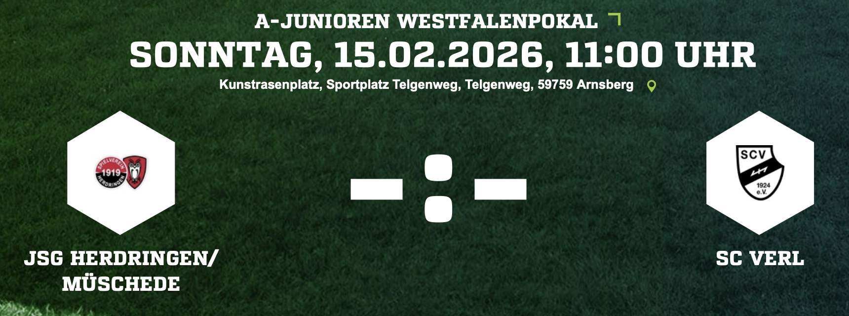 Neuansetzung nach witterungsbedingtem Ausfall: Am Sonntag, den 22.02.2026, trifft unsere A-Jugend in der zweiten Runde des Westfalenpokals in Müschede auf die A-Jugend des SC Verl.