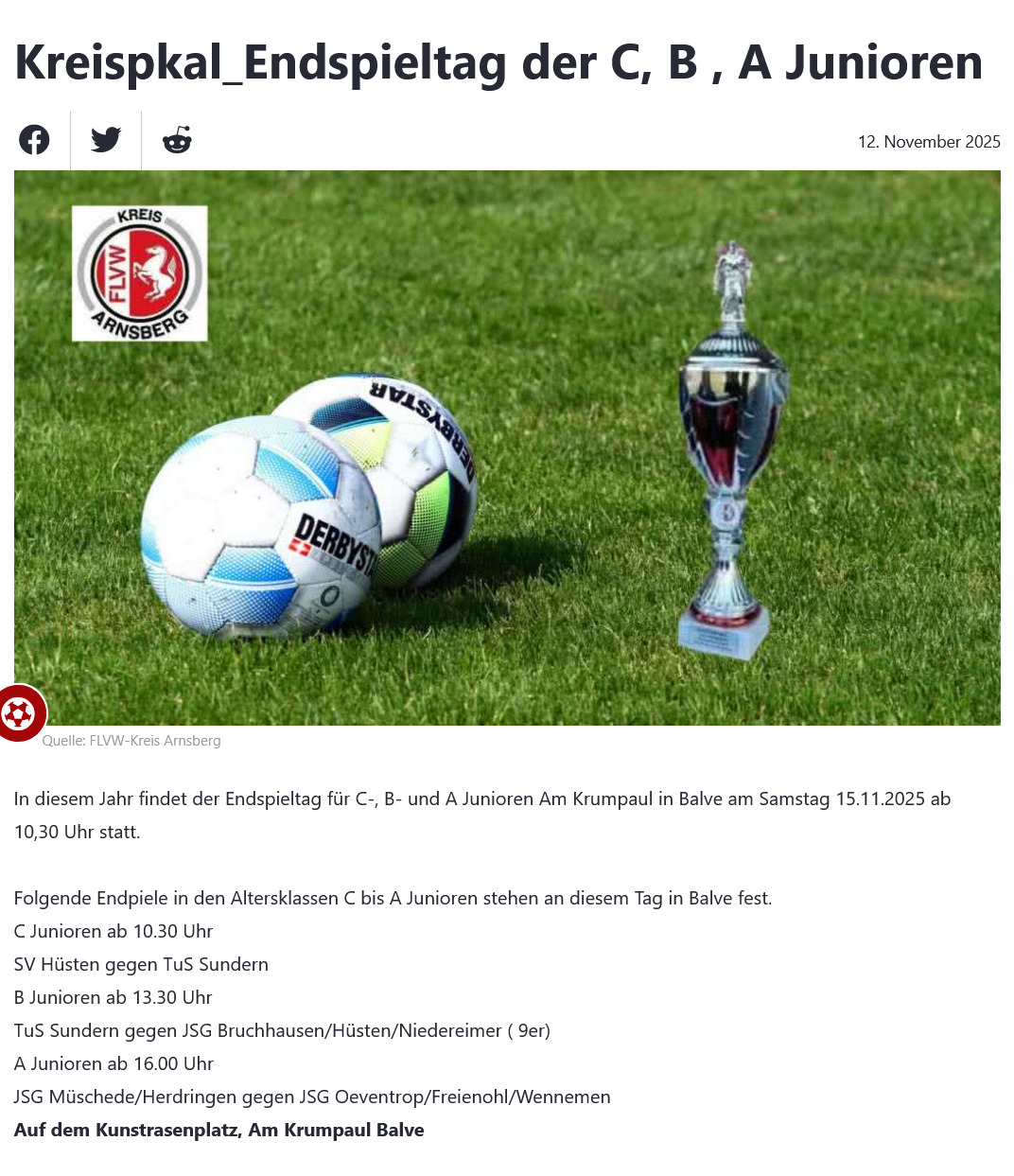 Am kommenden Samstag, den 15. November 2025, findet in Balve der große Kreispokal-Endspieltag der C-, B- und A-Junioren statt. Auch unsere A-Jugend der JSG Müschede/Herdringen hat es geschafft und steht verdient im Finale!